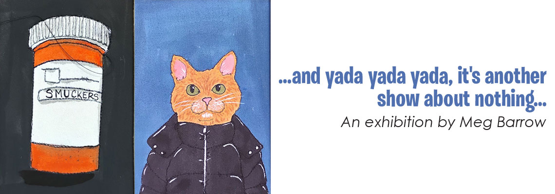 "In a world of subtle nuance and meaning within meaning, presented for you in thread and paint, brush stokes and stitches, the most straightforward, one dimensional, what you see is what you get collection of our generation. "...and yada yada yada, it's another show about nothing..." captures humor and the iconic good times via still lifes, exploring the golden camelot-esque age of bagged car phone, answering machine tapes, boom boxes carried atop shoulders on sidewalks and streets, and hand stamped borrowers library cards tucked neatly into book jacket covers..." - Meg Barrow